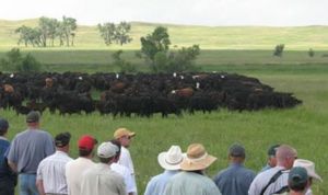 Mob-grazing in action. Note that the cattle are clustered tightly together, not scattered like on extensive pastures. This is necessary for the grass and soil to benefit.
