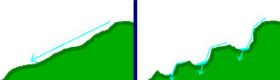 Swales are a simple and effective rainwater harvesting method that can be used anywhere. They are long depressions in the earth, dug along contour lines, with an earthen wall on the downhill side. Without swales, rainfall runs off the hillside (picture on left). When a series of swales are dug (picture on right), the rainfall cannot run off. It pools in the swales and gradually soaks into the soil. A single rainfall will then keep the soil wet for months or even years.