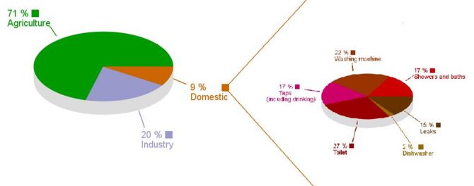 However, reducing the domestic use of water is only a small part of the puzzle. Agriculture is the main cause of water use —